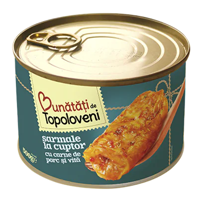 Složení: sarmale min. 68% (vepřové maso min. 25%, hovězí min. 25%, kvašené zelné listy min. 20%, cibule, rýže, slunečnicový olej, mrkev, rajčata, bílé víno, sůl, koření), voda, rajčatový protlak, koření a bylinky, kvašené zelí.